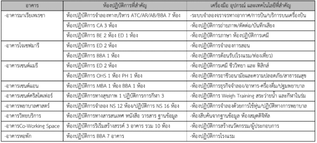 มหาวิทยาลัยมี อาคารเรียน ห้องสมุด ห้องเรียน ห้องปฏิบัติการ เครื่องมือ/อุปกรณ์ และเทคโนโลยี