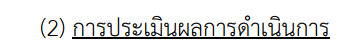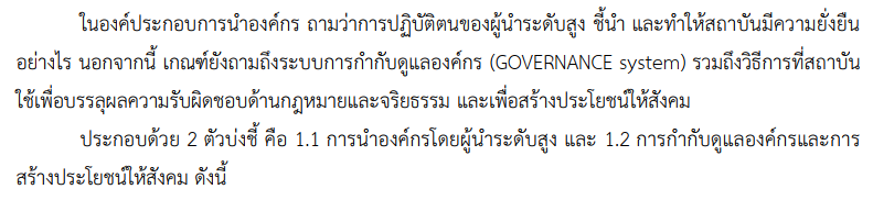 | (1) ระบบการกำกับดูแลองค์กร (2) การประเมินผลการดำเนินการ (1 คะแนน) | / | 1 |