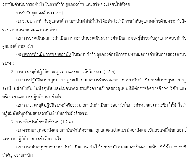 | สภาสถาบัน | ก ธรรมาภิบาล | การนำองค์การ | 2/ปี | ผลการประเมินสภาสถาบัน | ความโปร่งใส ตรวจสอบได้ เปิดเผยข้อมูล |