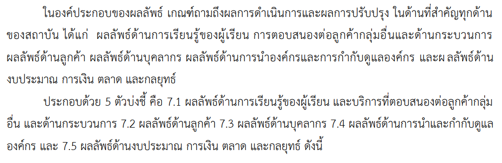 ส่วนที่ 3 องค์ประกอบที่ 7 ผลลัพธ์ (Criteria 7.1 ผลลัพธ์ด้านการเรียนรู้ของผู้เรียน และบริการที่ตอบสนองต่อลูกค้ากลุ่มอื่นและด้านกระบวนการ (Student Learning, Customer-Focused Service Results, Process Results))